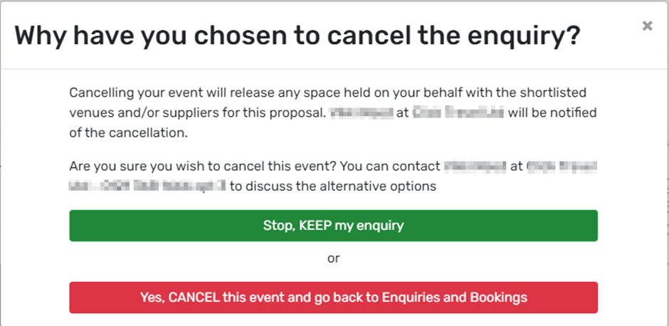 - To proceed with cancellation, click "Yes, CANCEL this event and go back to Enquiries and Bookings".