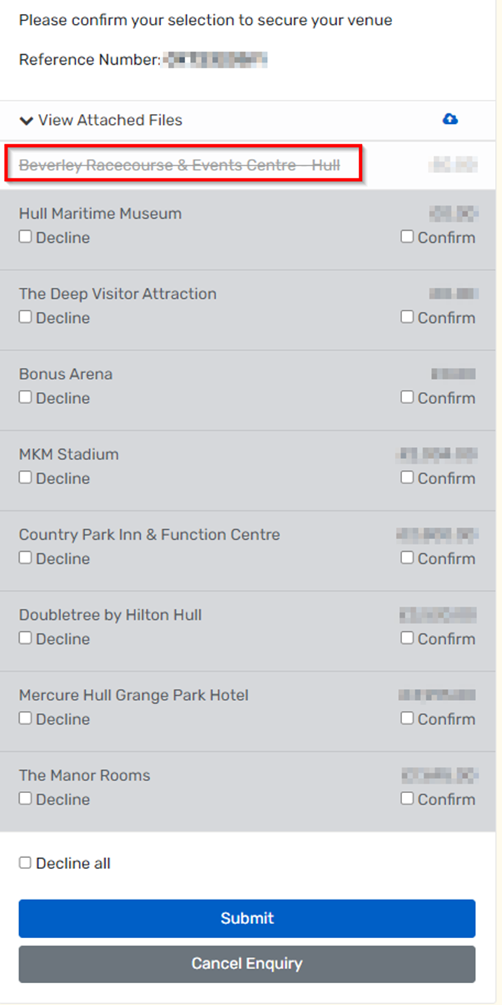 - To decline a venue, click "View" and access the list of venues on the left-hand side.