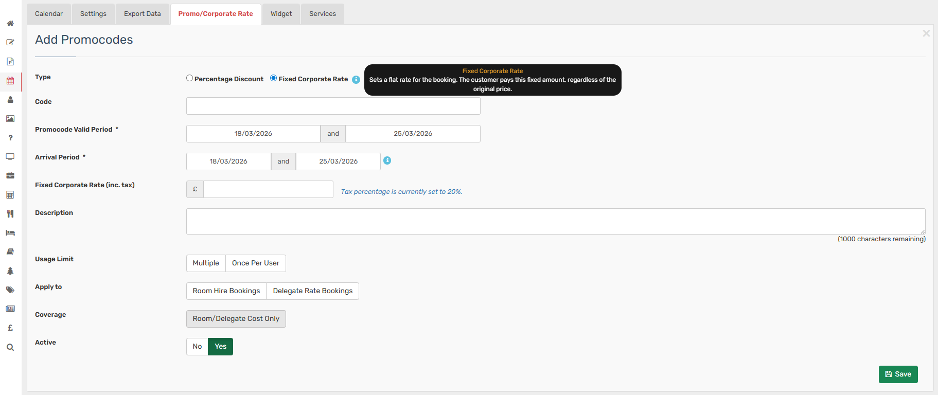 If the promocode is set up as a fixed Corporate Rate, enter the agreed fixed rate (including tax) in the appropriate rate field instead of a percentage.