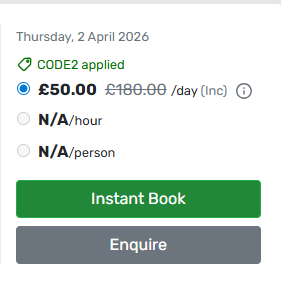 After running a standard venue search and selecting a venue, users can enter a Promo/Corporate Code on the Instant Book booking screen so the agreed fixed rate or % discount is applied directly to that booking.